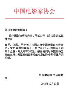 2015年11月10日,经中国影协研究决定,四川传媒学院电影电视系教师刘彤、于宁两位同志正式获批为中国电影家协会会员。这与两位教师长期以来对影视工作的热忱息息相关,也与电影电视系近年来在电影创作中取得优异的成绩密不可分。