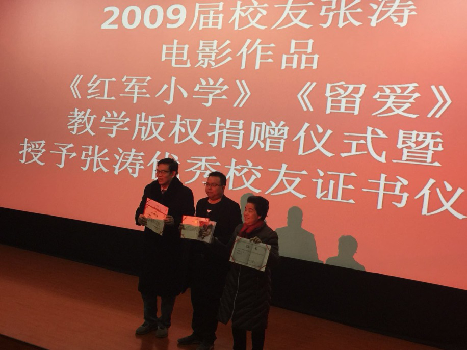 四川传媒学院电影电视学院毕业生张涛上台讲话,并叙述了《红军小学》《留爱》的创作情况。他在讲话中多次感谢学校领导的对其事业上的支持以及母校多年来对他的精心栽培。张涛表示,此次捐赠一方面是为了传承红军精神,希望更多的人受到红色思想教育,另一方面是为了弘扬影片中的社会主义核心价值观,彰显社会正能量。