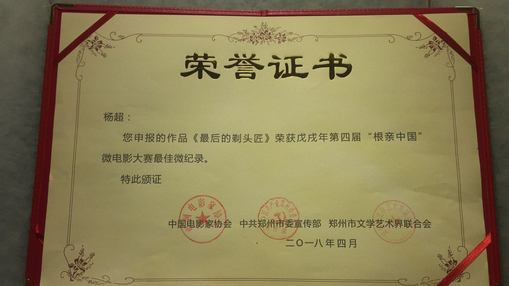 2018年4月16日,戊戌年第四届“根亲中国”微电影大赛颁奖礼在郑州举行。此次大赛汇集了来自大陆及港澳台地区选送的千余部作品,由四川传媒学院电影电视学院2013级毕业生杨超创作的纪录片《最后的剃头匠》从激烈的竞争中脱颖而出,斩获大赛“最佳微纪录”奖项。