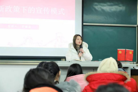 她向我们介绍了宣传的主要形式、宣传的媒介管理、宣传的管理原则和宣传方向。并告诉我们要合理的在自媒体上发表言论,不传谣、不造谣、做一个有思考、有态度、有品质的团学干部。