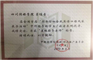 本刊讯(通讯员 罗梨丹)2019年8月30日,全国首届“图书馆杯”全民英语口语风采展示活动在广州图书馆落下帷幕。我院罗梨丹同学表现优异并取得了“英语口语金星(四星)”的佳绩,吕佳音老师获“星级指导教师”称号。