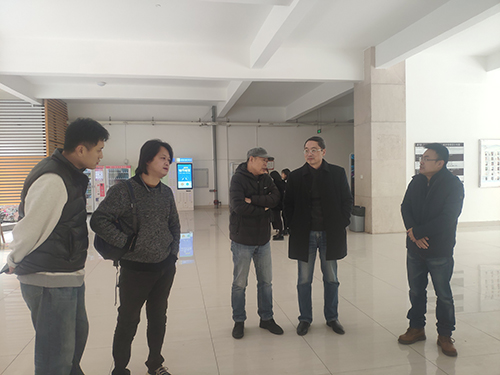 刘黎教授,强军老师,袁帅老师,程卓老师正在与秦旭老师互相探讨此次展览内容