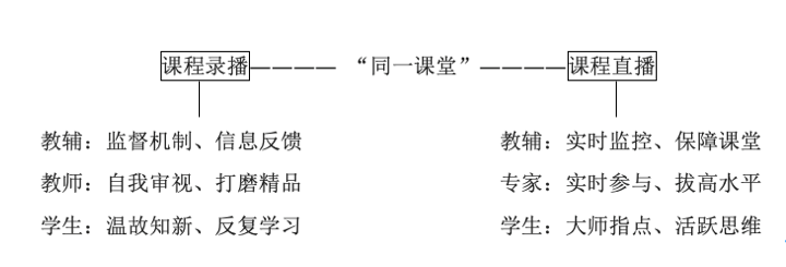 对于我校已有的良好的教学监督机制,“同一堂课”网络教研可依托于已经建立好的硬件设备完成准备部分,这也就保证了实施环节的录播课程部分,也就是说平时教师在上课的过程可直接进行直播或录播,这就形成良好的生态网络教学系统,如直播期间可请有关专家进行课堂教学互动,不仅能活跃课堂气氛,也能让学生提高的更快;而无专家指导时,录(复)播网络教学不仅是学生温故而知新的好帮手,更是教师打磨精品课程的利器。