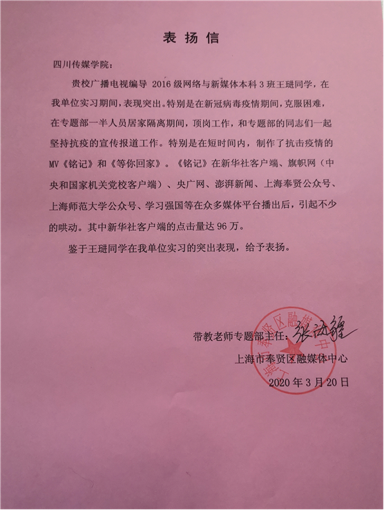 近日,四川传媒学院收到了来自上海市奉贤区融媒体中心的表扬信,对电影电视学院2016级广播电视编导(网络与新媒体)专业学生王琎同学实习过程中的优秀表现给予高度赞扬!