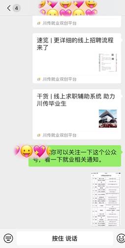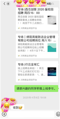 电影电视学院通过微信公众号“川传就业双创平台”联合智联招聘等社会招聘平台,随时发布“四川传媒学院线上招聘平台”的就业信息,让学生了解到相关的就业信息的同时,组织学生积极参加线上招聘,帮助到有就业需求的学生。