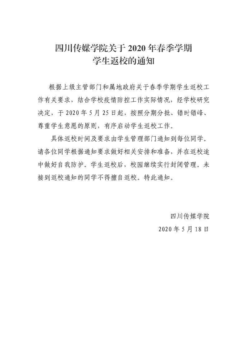 四川传媒学院关于2020年春季学期学生返校的通知