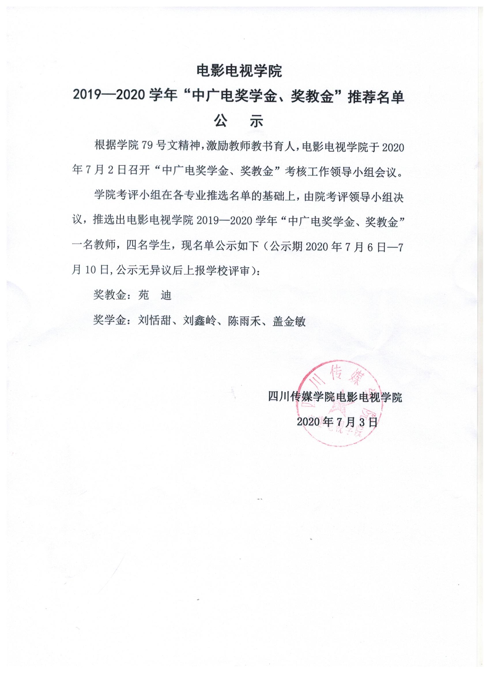 电影电视学院2019—2020学年“中广电奖学金、奖教金”推荐名单公示