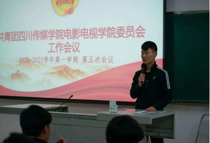 2020年10月13日晚,共青团四川传媒学院电影电视学院委员会团务工作例会在A8-405召开。共青团四川传媒学院电影电视学院委员会书记莫诚成,分团委学生副书记、学生会主席张垚及大三、大二各学生干部出席此次会议。