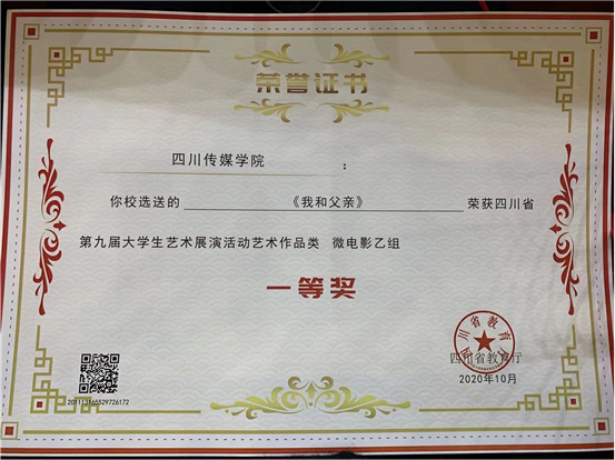 2020年11月18日星期三,由四川省教育厅主办的“四川省第九届大学生艺术展演活动”在四川文理学院、巴山大剧院等活动场地举行颁奖仪式。我系作品《我和父亲》荣获四川省第九届大学生艺术展演活动艺术作品类微电影乙组一等奖。