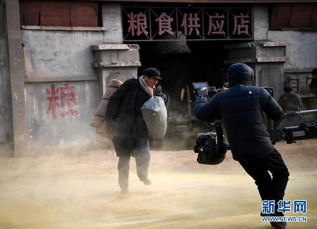 11月25日,焦裕禄扮演者郭晓东(左)在片场拍摄。新华社记者 王鹏 摄