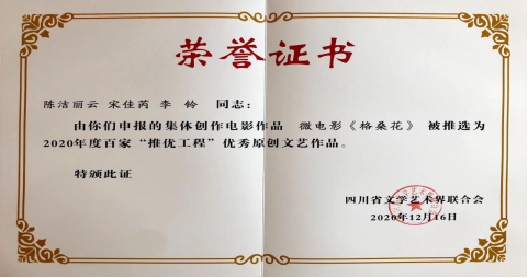 12月16日上午9时,由四川省文学艺术界联合会主办的“四川省文学艺术界联合会2020年度百家‘推优工程’发布会”在成都市新华宾馆圆满举行,电影电视学院教师陈洁丽云任艺术指导的微电影《格桑花》入选四川省文学艺术界联合会2020年百家“推优工程”。