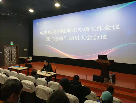 2020年1月4日上午10点,电影电视学院期末专项工作会议暨“磨课”动员大会在音视频创意中心110放映厅举行,电影电视学院副院长张乐平,党总支书记李杨,副院长吴建、李晓川,党总支副书记贺莉娅、朱晓彬,学院教学委员会主任徐先贵,院长助理赵耘曼、陆薇及全体教师参加会议,副院长李晓川主持会议。本次会议分为学院领导介绍期末各项工作安排、进行“磨课”动员两个部分。