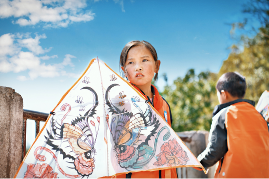 《放风筝的女孩》:该照片荣获2019年《国家地理》全球摄影大赛图片故事类·三等奖。当天志愿者老师带着孩子们在上手工课,小女孩慢其他同学一步做好风筝。当同学们都已经将自己的风筝放飞时,她看着手中的风筝不知所措,清澈的眼睛里是对放飞梦想的渴望。