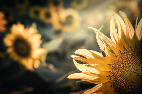 《向阳而生》:向日葵上有一只小蜜蜂在采蜜,此时一束光芒刚好从右上角打下来。温暖的光芒和向日葵交相呼应,给人积极向上的感受。