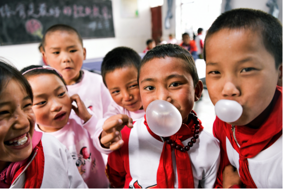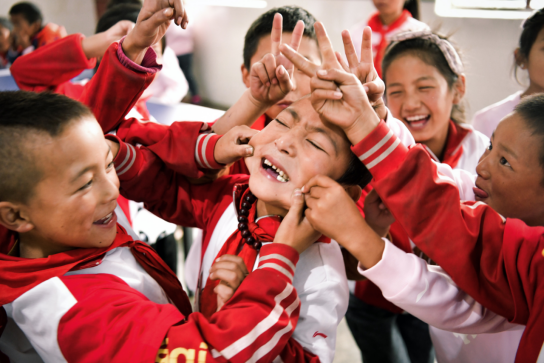 《笑脸与苦脸》:孩子们下课比赛吹泡泡期间,其中一个小男孩特别调皮,他会悄悄地扎破别人吹起来的泡泡,然后溜之大吉。后来在我(杨澜青)邀请为他们拍照的时候,小男孩第一个跑过来,却被大家“抓住了”。我快速地抓拍下这张照片,命名为:笑脸与苦脸。