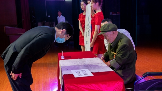 抗美援朝老战士周全弟是被世界军事史上称为最为惨烈的战役—长津湖战役的亲历者,他在零下四十度的冰天雪地里埋伏三天三夜,严重冻伤导致16岁的他失去了双腿双手。周老始终没有放弃对生活的希望,苦练抱笔书法,并在现场书写了四川传媒学院校训“博学笃行、德艺双馨”,赠与我校。