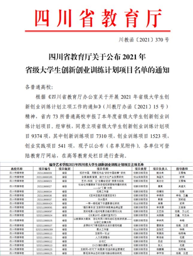 近日,四川省教育厅公布了 2021年省级大学生创新创业训练计划项目名单,编导艺术学院共计获批省级“双创”项目20项。我院将以大学生创新创业训练计划项目为载体,强化培养学生的创新精神、创业意识和创新创业能力。