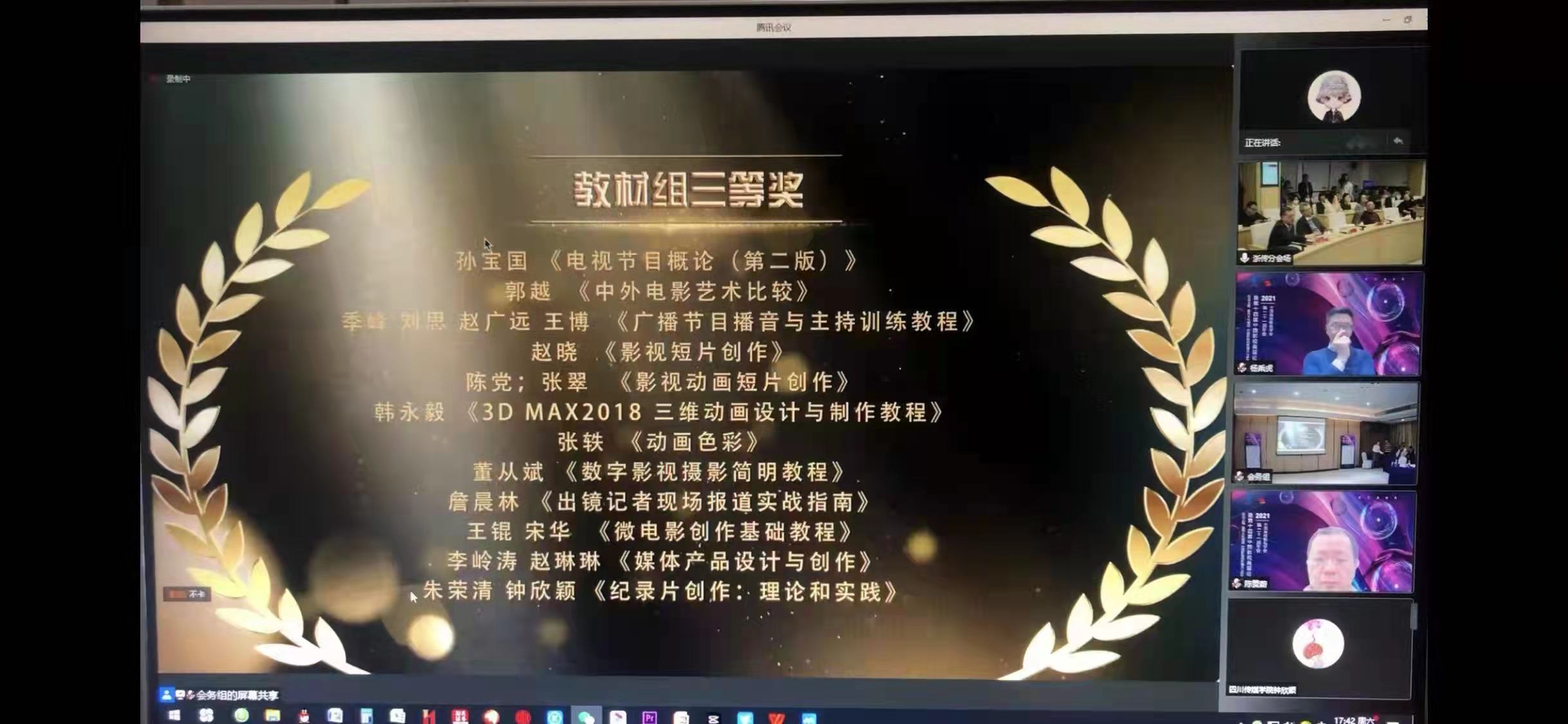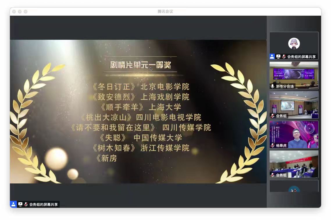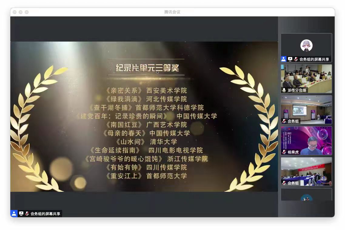 12月4日晚,中国高校影视学会2020-2021年度学术成果、影视作品推优活动暨第十四届“学会奖”、第十届“学院奖”颁奖仪式以线上线下结相合的方式举行,其中,我院青年教师陈洁丽云、刘姝昱指导的学生作品《请不要和我留在这里》获剧情片单元学生组一等奖、《有始有钟》获纪录片单元学生组三等奖;我院青年教师朱荣清编著的《纪录片创作:理论和实践》获“学会奖”教材组三等奖。
