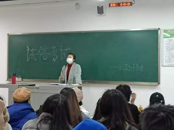 班会上,各班辅导员结合学生手册向同学们具体讲解了作弊行为、违纪行为的种类,以及相应处罚规则;通过真实案例向同学们揭示侥幸心理的危害,明确作弊不仅是对自己能力的否定和蔑视,更是对优良学风的亵渎;作弊者不仅丢掉了自己的诚信,更放弃了做人的尊严。树道德之新风,立诚信之根本是当代学生义不容辞的责任,并希望同学们诚信应考,做一名遵规守纪的大学生。