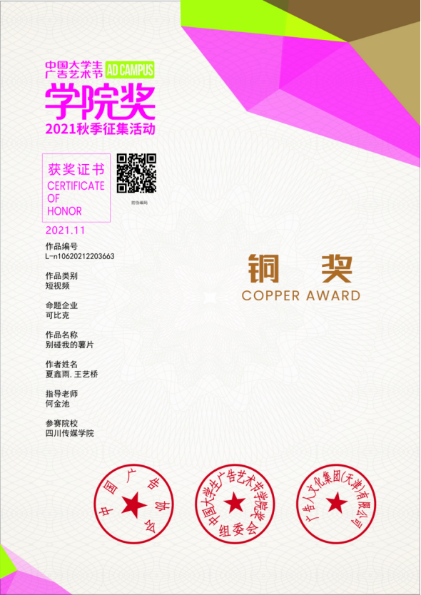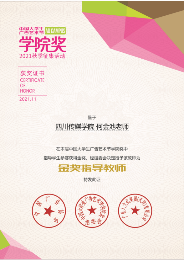 12月12日,2021年中国大学生广告艺术节学院奖秋季作品征集活动在厦门落幕,编导艺术学院2019级影视编导专业学生李桂连、周雨露、陈静瑶、周芳、张婉玉作品《皇家传承的秘方》获“广誉远”命题金奖,2019级影视编导专业学生夏鑫雨、王艺桥作品《别碰我的薯片》获“可比克”命题铜奖,2019级广播电视编导专业学生李禧炜、魏祎祯、刘佳雯、董亚飞、胡纪欣作品《“纸”因有你》获“恒安品诺”铜奖,我院青年教师何金池获“金奖指导教师”荣誉。