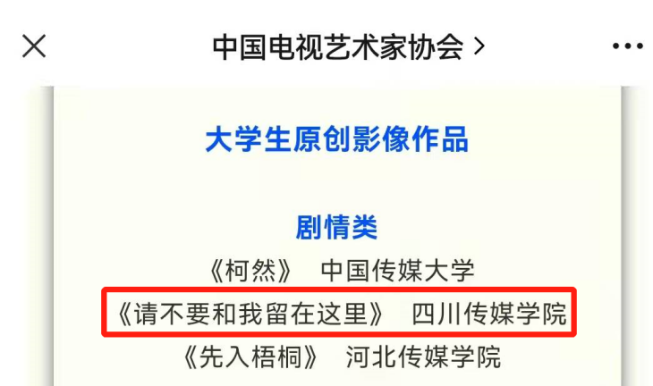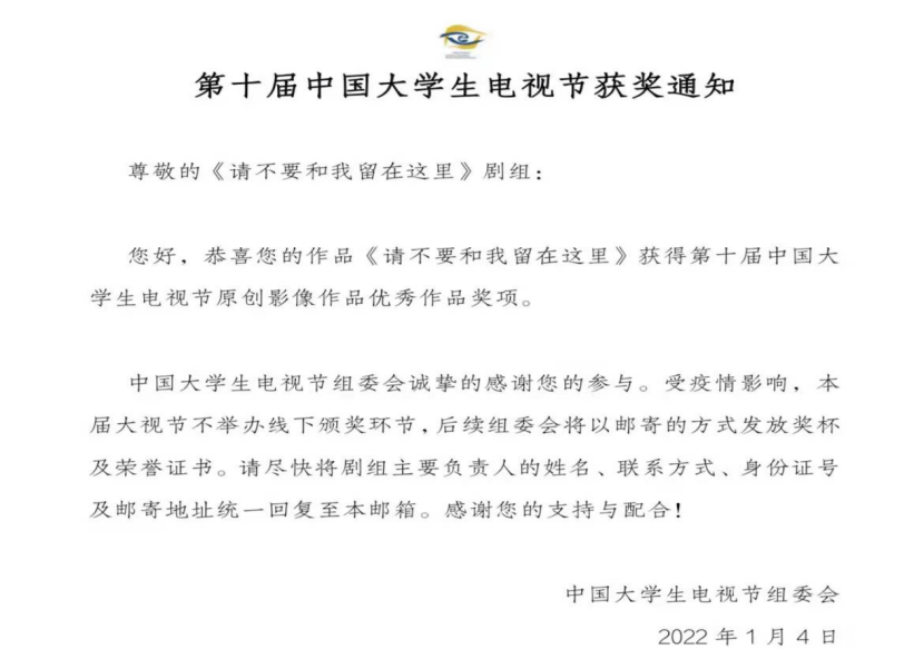 编导艺术学院学生作品《请不要和我留在这里》荣获第十届中国大学生电视节原创影像作品优秀作品奖