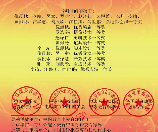 用光影讲述中国故事、传递生活温度、弘扬艺术精神,我院学生大胆进行影像创作,花满艺术阆苑。倪晨越在我院求学期间创作的《租时间的孩子》曾获2018年“青年荣耀·中华美育情”微电影创作一等奖,该生获优秀编剧、导演一等奖等多个奖项。