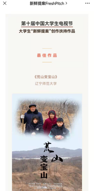 2022年1月7日,第十届中国大学生电视节落下帷幕,四川传媒学院编导艺术学院2019届毕业生、辽宁师范大学在读研究生倪晨越作品《荒山变宝山》荣获大学生“新鲜提案”创作扶持作品“最佳作品”。据悉,本次大学生“新鲜提案”创作扶持活动共收到来自全国96所院校的389个以“乡村振兴和共同富裕”为主题的提案作品,根据报送作品的选题、立意、完整性、可执行性等因素,遴选出3部最佳作品、10部优秀作品进行扶持。