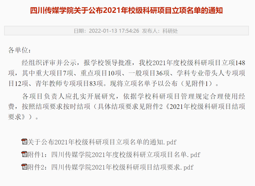 1月13日,四川传媒学院2021年校级科研项目立项名单公布,本次我校共计立项148项,我院获批科研项目立项21项,其中,研究类重大培育项目1项,创作类重大培育项目2项,创作类重点培育项目1项,研究类一般培育项目1项,创作类一般培育项目3项,研究类青年教师专项项目8项,创作类青年教师专项项目5项。