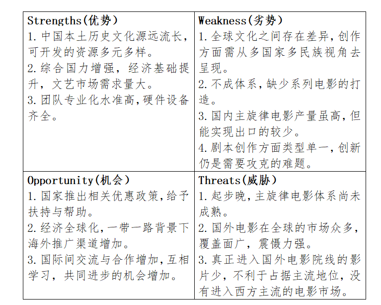 中国主旋律电影走出去的SWOT分析图