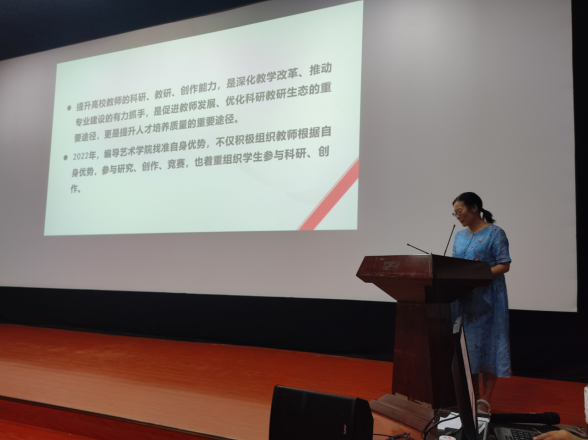 王雪梅副院长讲话,总结了本学期学院教师发表论文,立项省级教改质量工程项目,立项科研、教改项目,建设教材、在线课程,组织学生参与竞赛、发表论文、创作等科研、教改工作成果,并介绍了学校下发的科研、教研相关文件,鼓励教师积极开展科研、教研,提升自我。