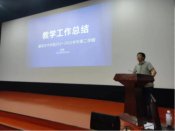 吴建副院长讲话,一方面,介绍了本学期教学工作及下学期教学筹备工作,强调教师应不断提升专业能力,适应高校内涵式发展需求。另一方面,介绍了本学期期末校级论文(设计·作品)抽查反馈、自查课程考核装袋材料情况,强调进一步规范教学工作。