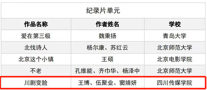 据悉,该活动由中宣部教育部、北京市政府及北京市委宣传部批准与支持,由北京师范大学主办,是华语地区历史最久、影响最大的学生影像作品赛事,受到海内外各高校师生的广泛关注。此次大赛原创影片推选共收到作品2000余部,共有135部作品入选最终轮推选,其中,纪录片单元共有30部作品入选。