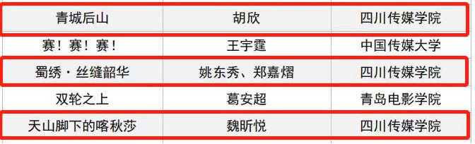 8月5日,第29届大学生电影节·第22届国际大学生原创影片推选活动公布入选名单,由四川传媒学院编导艺术学院夏浪波老师指导,2020级广播电视编导专业学生魏昕悦、张云帆、李娜纬、罗佳伟、彭泰达、2020级影视摄影与制作专业学生李子豪、孟子杰共同创作的《天山脚下的喀秋莎》,2020级广播电视编导专业学生盛有志、胡欣、高梓菡、周俞辰共同创作的《青城后山》 ,由张乐平老师指导,2020级广播电视编导专业学生王博、伍聚业、窦婧妍共同创作的《川剧变脸》,由杨雅惠老师指导,2018级广播电视编导专业学生姚东秀、郑嘉熠共同创作的《蜀绣·丝缝韶华》等四部作品入选纪录片单元最终轮推选。