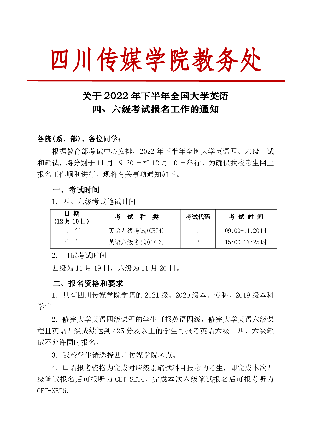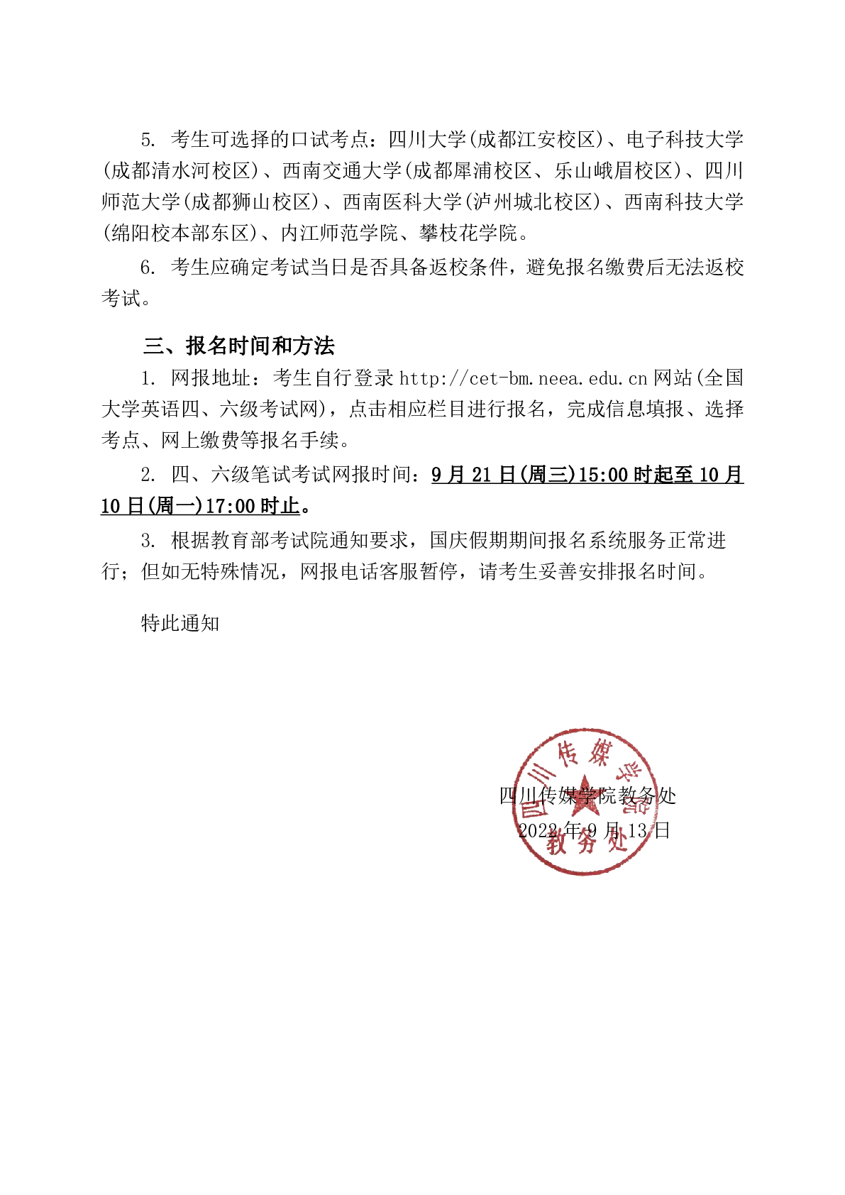 四川传媒学院教务处关于2022年下半年全国大学英语四、六级考试报名工作的通知