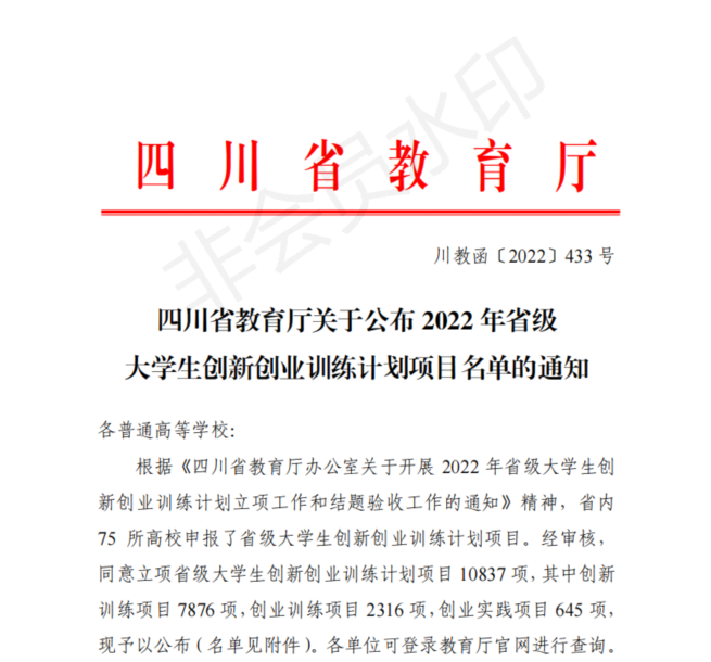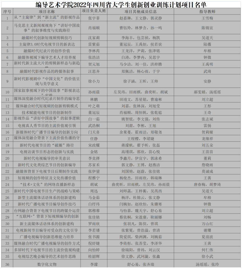 9月19日,四川省教育厅公布了 2022 年省级大学生创新创业训练计划项目名单,四川传媒学院206项计划获批立项,编导艺术学院广播电视编导专业36项计划获批立项。