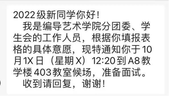 短信通知以下图为基准,请同学们按时参加面试。编导艺术学院分团委·学生会欢迎大家的到来!