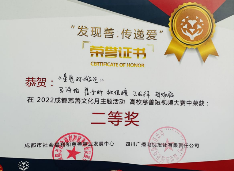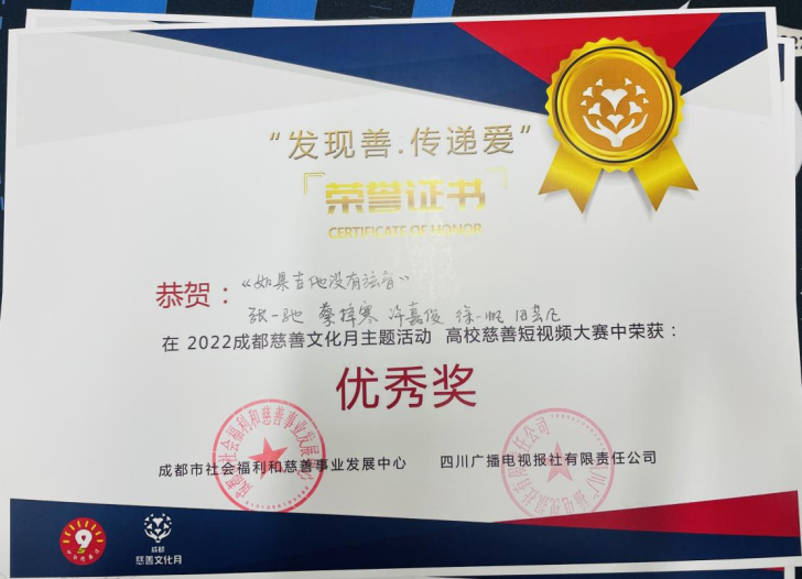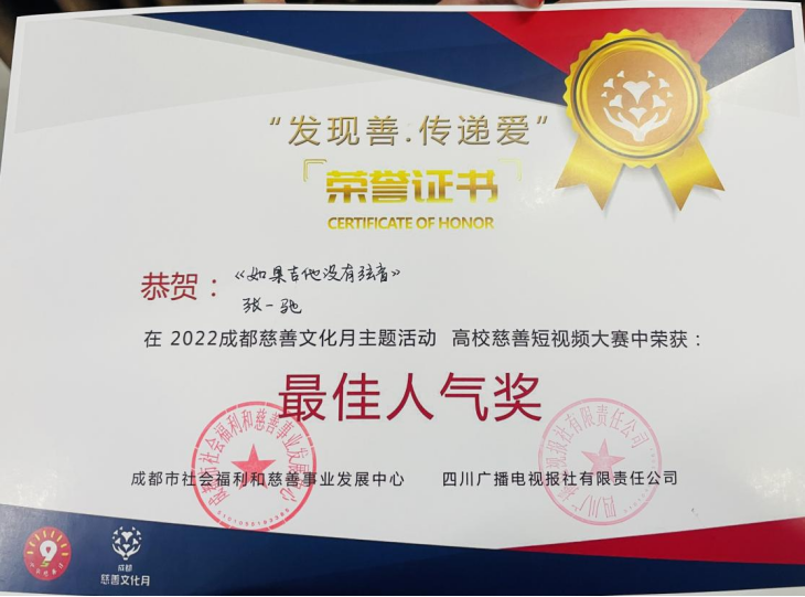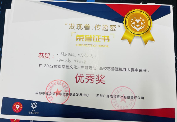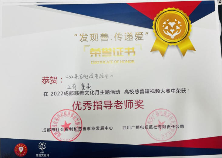 近日,由中共成都市委城乡社区发展治理委员、成都市民政局、成都市红十字会主办的“高校慈善短视频大赛”落下帷幕,由我院教师赵耘曼指导、2020级广播电视编导专业马诗怡、翟予昕、张恒瞳、王龙祥、胡淞舜等同学创作的《星愿环游记》获“二等奖”,赵耘曼老师获“优秀指导教师”。由王奇、董莉老师联合指导,2021级广编电视编导专业学生张一驰、蔡梓寒、许嘉俊、徐一帆、田芸凡创作的《如果吉他没有弦音》获“优秀奖”“最佳人气奖”,王奇、董莉老师获“优秀指导教师”。由霍战朝老师指导,2021级广编电视编导专业学生舒心易等创作的《形如微尘·大爱蓉城》获“优秀奖”,霍战朝老师获“优秀指导教师”。