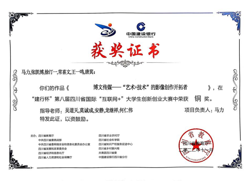 近日,由四川省教育厅主办的“建行杯”第八届四川省国际“互联网+”大学生创新创业大赛公布获奖名单,四川传媒学院编导艺术学院广播电视编导专业师生斩获佳绩。由王雪梅、郝雯婧、吴道天、龙继祥老师指导,2021级广播电视编导专业学生张一驰负责的《基于媒体大脑的智媒体融合平台——网络视听内容生产变现先行者》荣获金奖,我院王雪梅老师获“优秀指导教师”;由王雪梅、武琦、郝雯婧、王禹明、贺莉娅老师指导,学生海蓝天负责的《童言熙语——争做青少年语言素质教育引领者》,由吴道天、莫诚成、安静、龙继祥、何仁伟老师指导,学生马力同学负责的《博文传媒——“艺术+技术”的影像创作开拓者》,由郝雯婧、王雪梅、陆薇、王奇老师指导,2021级广播电视编导专业学生耿丽娜负责的《智能媒资一键触达——智媒时代媒体资源整合领航员》,由陆薇、牟榕、莫诚成、王禹明老师指导,2019级广播电视编导专业学生雷紫茹负责的《构筑短视频中央厨房——5G时代内容生产先遣者》等4个项目荣获铜奖。