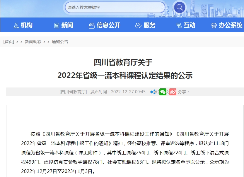 2022年12月27日,四川省教育厅公示了2022年省级一流本科课程认定结果,由我院广播电视编导专业教师王雪梅、王禹明、吴道天、王奇、牟榕申报的《广播电视编导专业实践》课程,由我院广播电视编导专业教师陈洁丽云、雷扬、刘姝昱、陈臣、薛芮申报的《电视节目策划》课程获批省级一流课程。