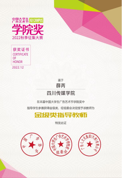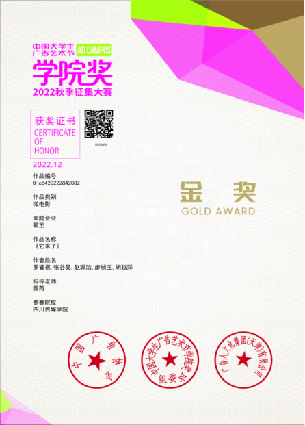 近日,中国广告协会主办的中国大学生广告艺术节学院奖2022秋季征集大赛·青春盛典于厦门国际会展中心圆满落幕。由我院广播电视编导专业教师薛芮指导,2020级广播电视编导专业学生罗睿祺、张谷昊、赵珮洁、廖桢玉、胡越洋创作的微电影广告作品《它来了》荣获金奖,指导老师薛芮被授予金奖指导教师荣誉。