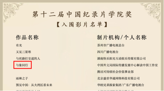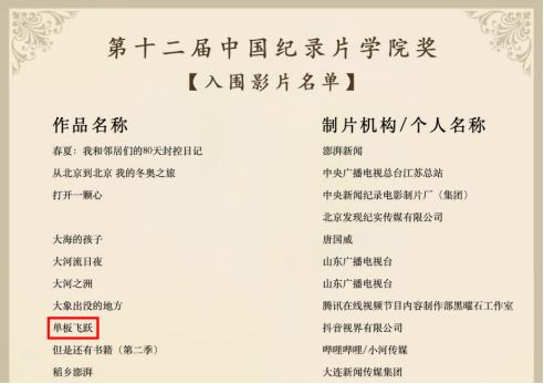 12月26日,由中国传媒大学主办的第十二届“光影纪年”——中国纪录片学院奖(CAADF)公布入围影片名单,我院广播电视编导专业教师甘鑫参与创作的《单板飞跃》《与象同行》同时入围。