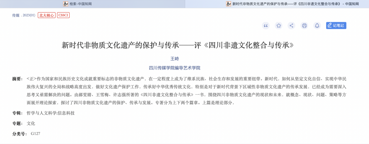 2023年1月10日,我院广播电视编导专业王峙老师撰写的论文《新时代非物质文化遗产的保护与传承——评《四川非遗文化整合与传承》》在《传媒》上发表。该文针对郝雯婧、王雪梅、许志强所著的《四川非遗文化整合与传承》一书,围绕四川非物质文化遗产的现状和未来,就概念、现状、问题、策略等方面展开理论探索,探讨了四川非物质文化遗产的保护、传承与发展。