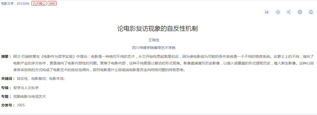 2023年3月15日,我院广播电视编导专业王琦佳老师撰写的论文《论电影复访现象的自反性机制》在《电影文学》上发表。该文认为:阿兰·巴迪欧曾在《电影作为哲学实验》中提出:电影是一种绝对不纯的艺术,从它开始构思起就是如此,因为使电影成为可能的条件系统是一个不纯的物质系统。此意义上的不纯,指向了电影产业的多方协作,更是指向了电影内部性的问题。聚焦于电影内部,这种不纯更是以复访的形式现身。影像直接援引历史影像,以插入或覆盖的形式提取历史,植入新生影像。这种以自身言诉自我的方式构成了电影艺术的自反性倾向,即对电影是什么抑或说电影是否走向终结问题的终极思考。