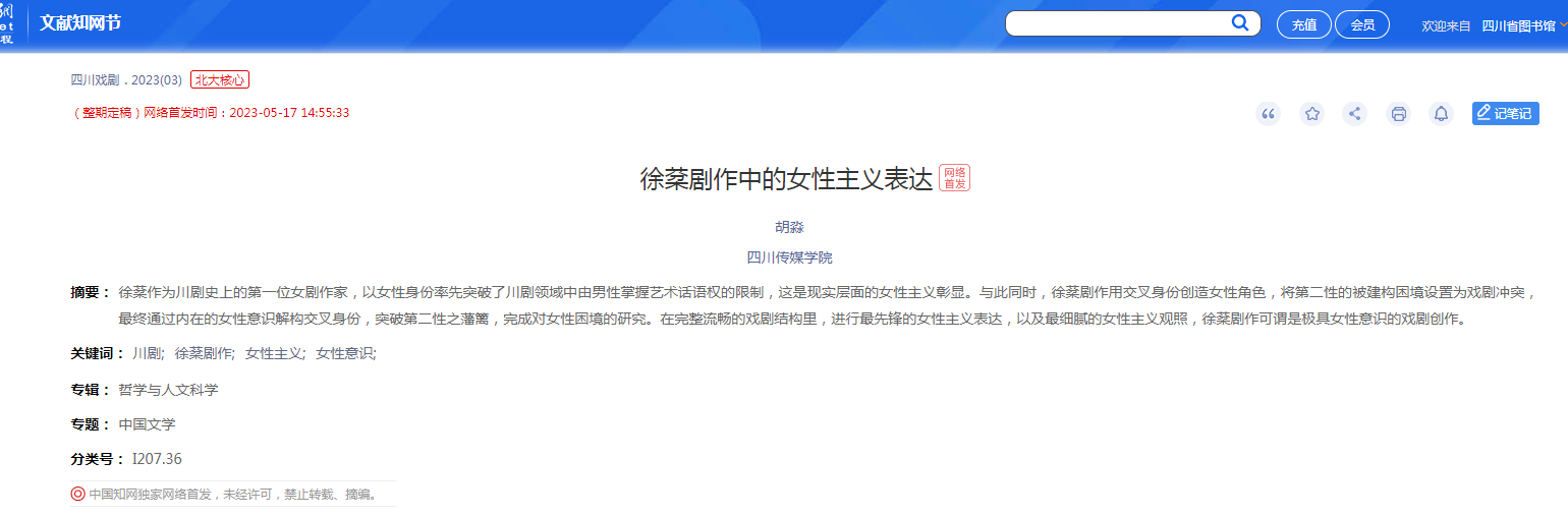 2023年5月17日,我院广播电视编导专业胡淼老师撰写的论文《徐棻剧作中的女性主义表达》在《四川戏剧》上发表。该文认为:徐棻作为川剧史上的第一位女剧作家,以女性身份率先突破了川剧领域中由男性掌握艺术话语权的限制,这是现实层面的女性主义彰显。与此同时,徐棻剧作用交叉身份创造女性角色,将第二性的被建构困境设置为戏剧冲突,最终通过内在的女性意识解构交叉身份,突破第二性之藩篱,完成对女性困境的研究。在完整流畅的戏剧结构里,进行最先锋的女性主义表达,以及最细腻的女性主义观照,徐棻剧作可谓是极具女性意识的戏剧创作。