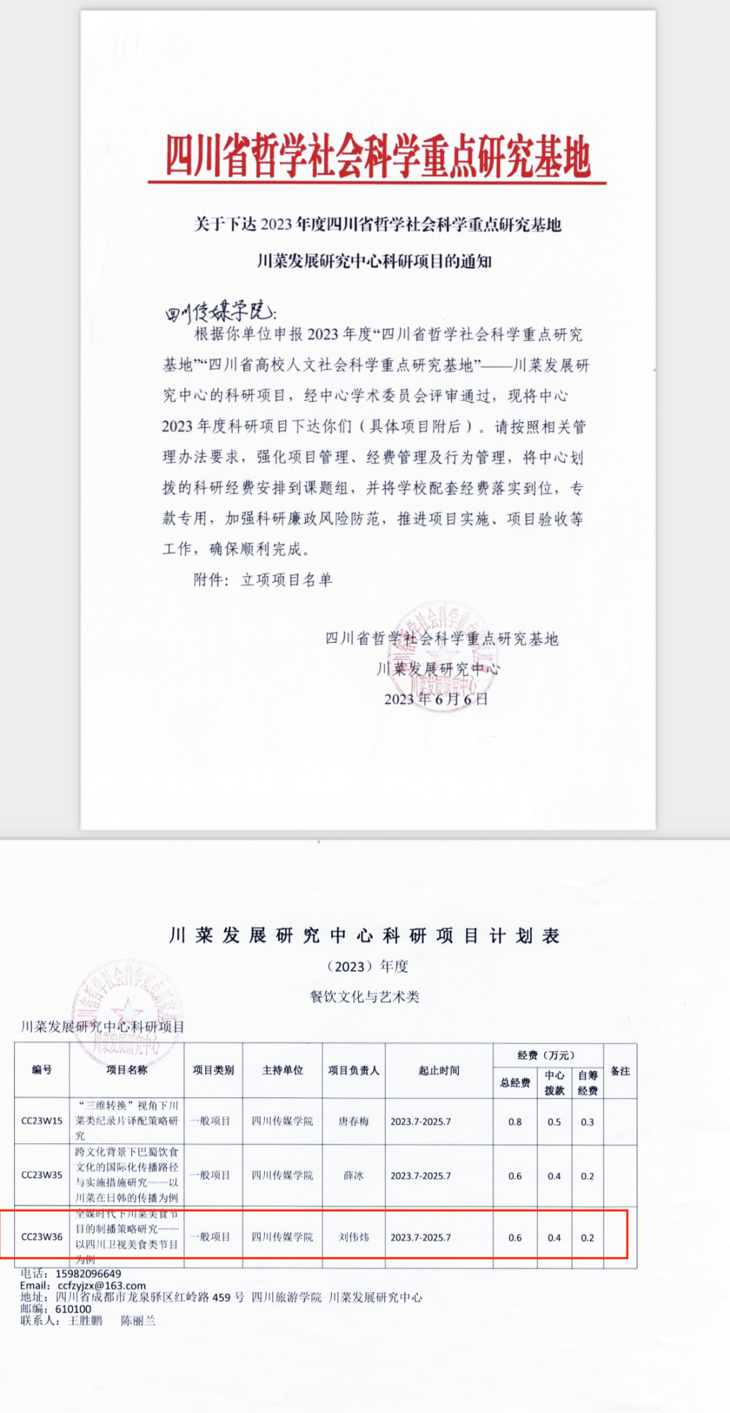 近日,川菜发展研究中心公布了2023年度科研立项项目立项名单,我院教师刘伟炜申报的《全媒时代下川菜美食节目的制播策略研究—-以四川卫视美食类节目为例》获批立项。该项目立足于全媒体时代,探讨广播电视节目的制播策略,对于四川美食文化的传播推广、传媒行业转型升级具有价值和意义。