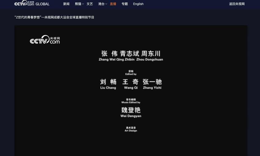 随着成都第31届世界大学生夏季运动会的正式启幕,成都已进入“大运时刻”,大运会文化展示活动也同步启动。2023年7月29日晚18:00,主题为“Z世代的青春梦想——央视网成都大运会全球直播特别节目”在央视网海外频道向全球观众直播。我院广播电视编导专业影视后期制作教研室刘畅、王奇、吴道天老师带领张一驰等学生制作团队参与创作,负责该节目的影像内容拍摄和后期剪辑包装。