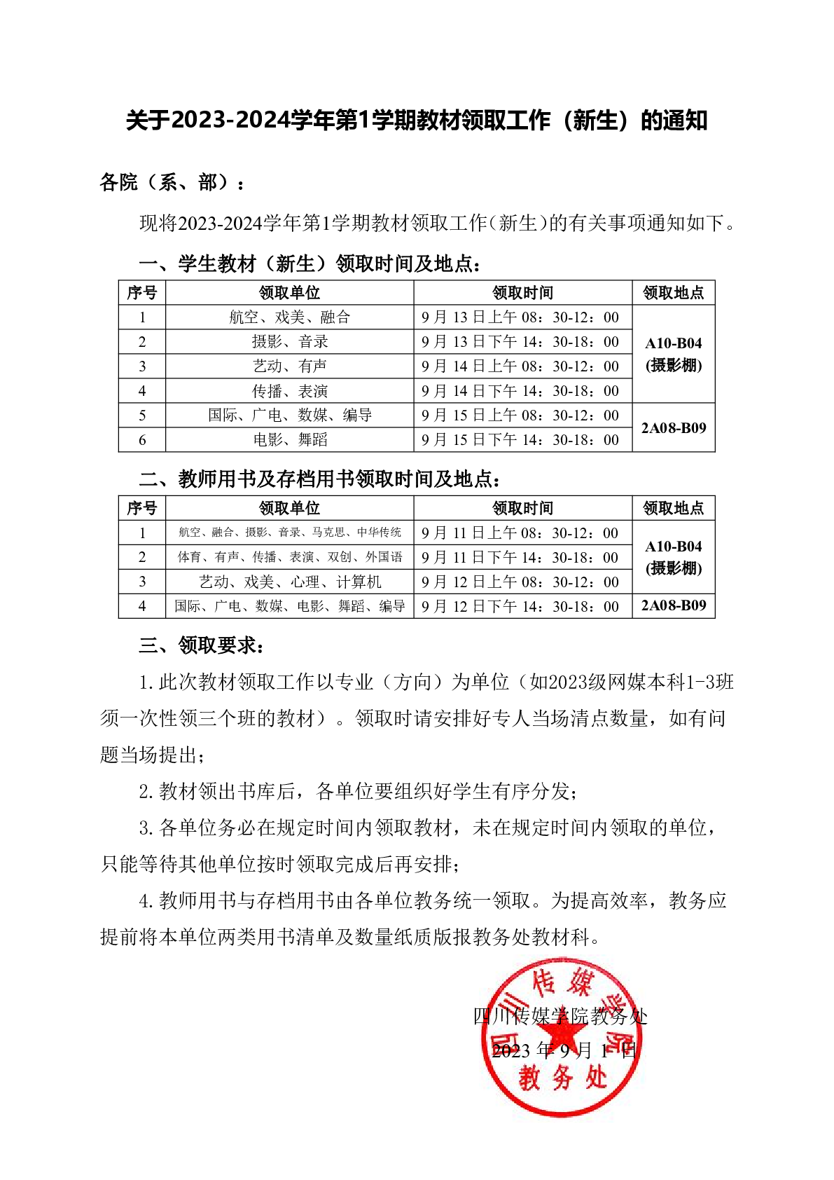 关于2023-2024学年第1学期教材领取工作(新生)的通知