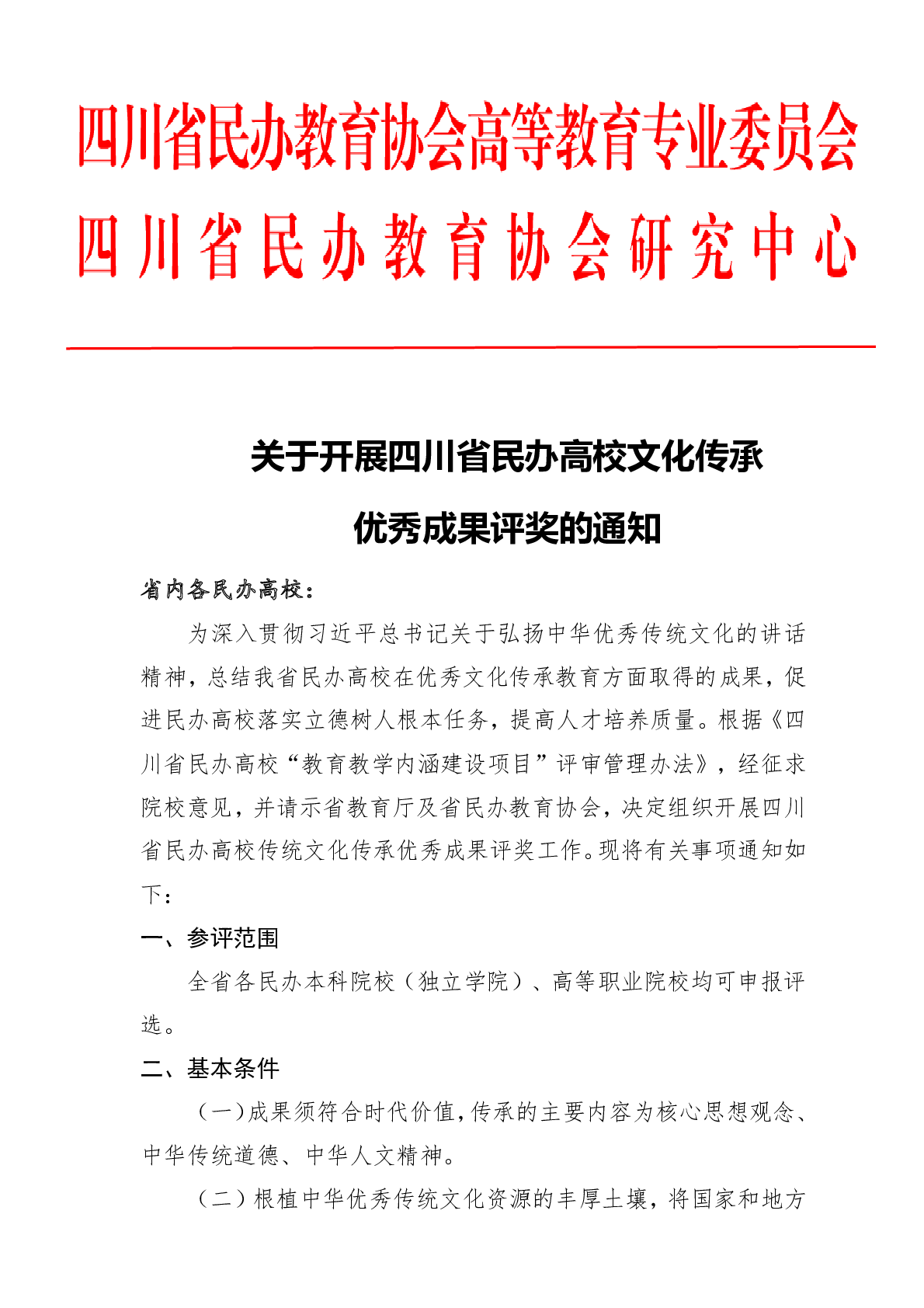 关于开展四川省民办高校传统文化传承优秀成果评奖的通知