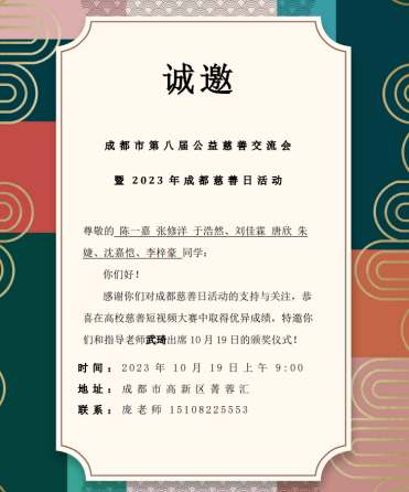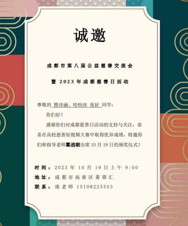 10月19日,由成都市民政局、成都市精神文明建设办公室、中共成都市委城乡社区发展治理委员会主办的“高校慈善短视频大赛”落下帷幕。由我院广播电视编导专业教师霍战朝指导,2022级广播电视编导专业熊诗涵、哈怡冰、张好等同学创作的《1•3餐》荣获“一等奖”。同时,由霍战朝老师指导,2022级广播电视编导专业孙文贤、徐多、邓羽含等同学创作的《染》荣获“二等奖”。由武琦老师指导,2022级广编电视编导专业学生陈一嘉、张俢洋、于浩然、刘佳霖、唐欣、朱婕、沈嘉恺、李梓豪创作的《关“艾”》荣获“三等奖”。