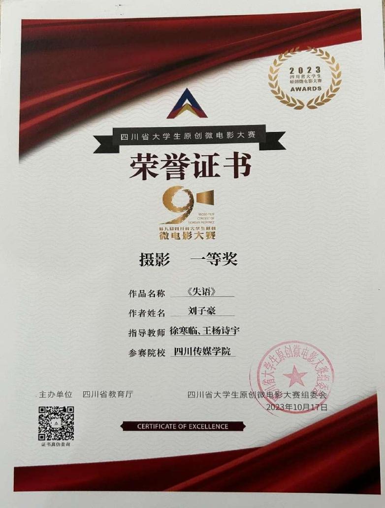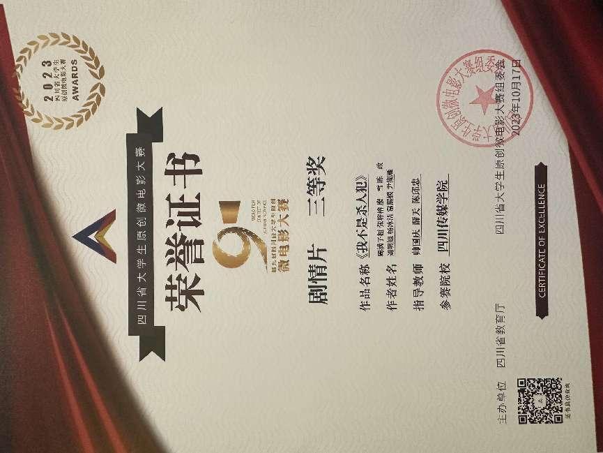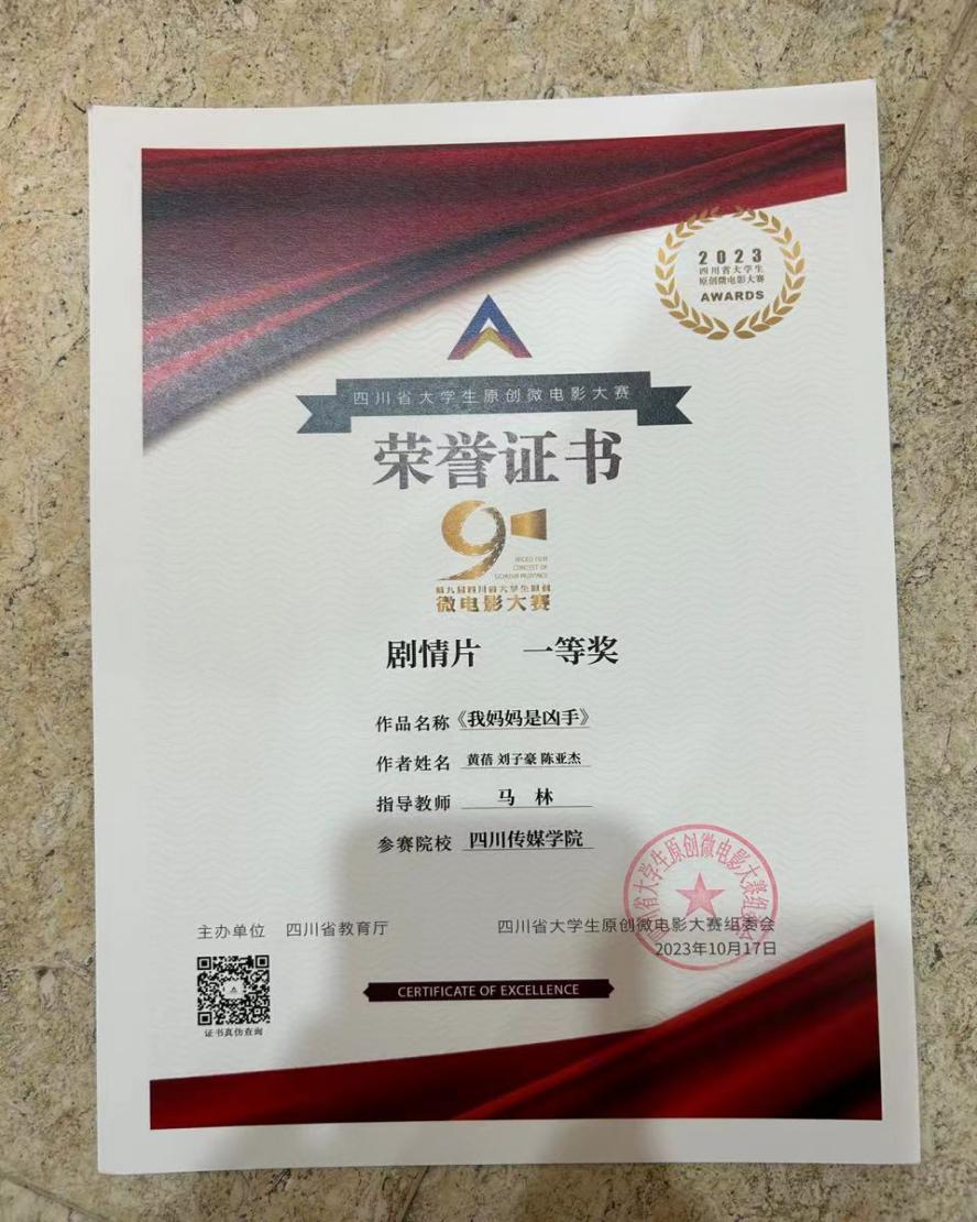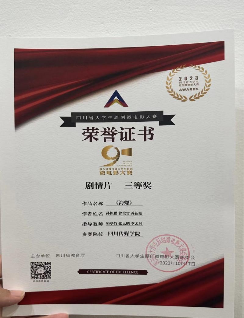 10月17日下午,第九届四川省大学生原创微电影大赛颁奖典礼在成都锦城学院圆满落幕。我院在此次大赛中收获颇丰,其中黄蓓、刘子豪、陈亚杰同学的作品《我妈妈是凶手》荣获剧情片一等奖、编剧一等奖、导演三等奖、表演三等奖;孙振鹏、曾俊哲、苏新皓同学的作品《海螺》获剧情片三等奖;周满子桓、张垿榕、廖雪、陈政、刘明旭、杨冰洁、常熙媛、尹湖雁同学的作品《我不是杀人犯》获剧情片三等奖、表演二等奖;黄蓓同学的作品《失语》获摄影一等奖、导演二等奖、表演三等奖。另外徐寒临老师、王杨诗宇老师、马林老师获优秀指导教师奖;四川传媒学院获优秀组织奖。